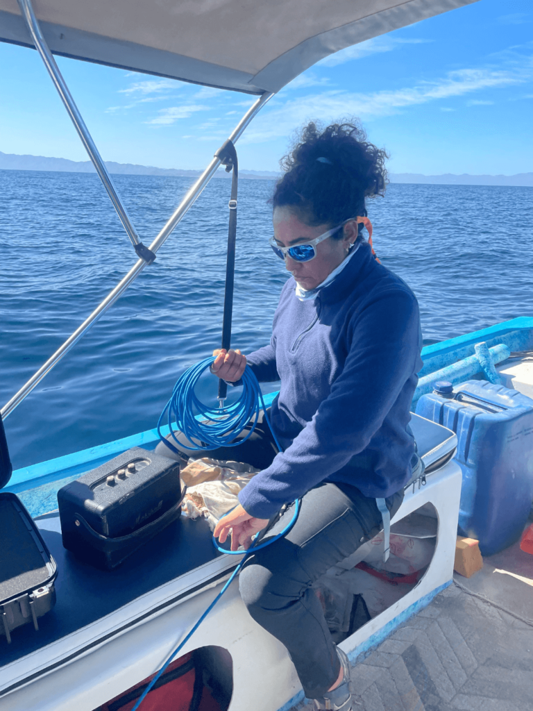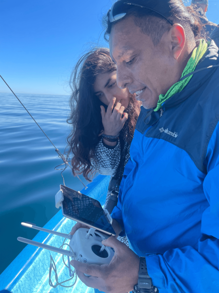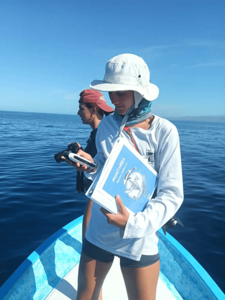 For cetaceans, we collaborate with Dr. Hiram Rosales Nanduca and Dr. Esther María Jiménez from MMAPE (Megafauna Marina y Pesquerías) in La Paz, who have studied whales and dolphins in Mexico for over 20 years. The data we collect supports their ongoing research on cetacean behavior, ecology, and population dynamics—tracking movements, feeding, social structures, and reproduction.
